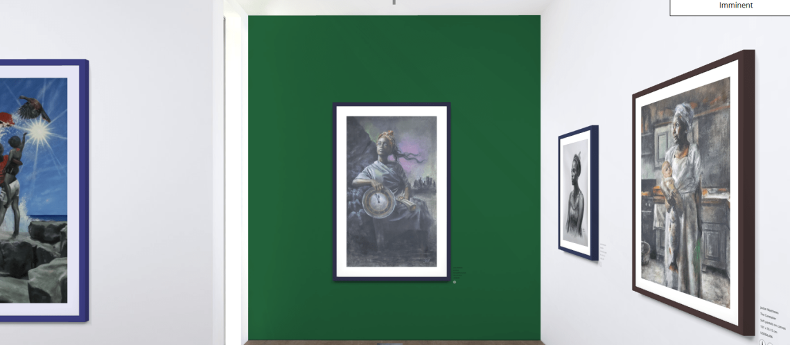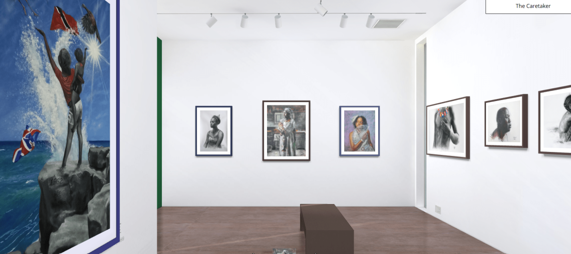 Jadon Matthews’ artworks are more than that. Some of them are portraits of contemporary Caribbean people who carry the weight of history of their country such as the three portraits of women Steadfast, The Caretaker and French Creole girl, cleverly hung together in this exhibition as they tell the story of women in the Caribbean. Others are full of symbolism like Young Nation, the only oil painting, which represents the independence of Trinidad and Tobago and, through the position of its characters, invites the viewer to look at the promise of a free future in the open sea and sky. It also makes a symbolical statement of strength and perennity through the use of oil painting instead of charcoal or soft pastel, more delicate and fragile mediums.