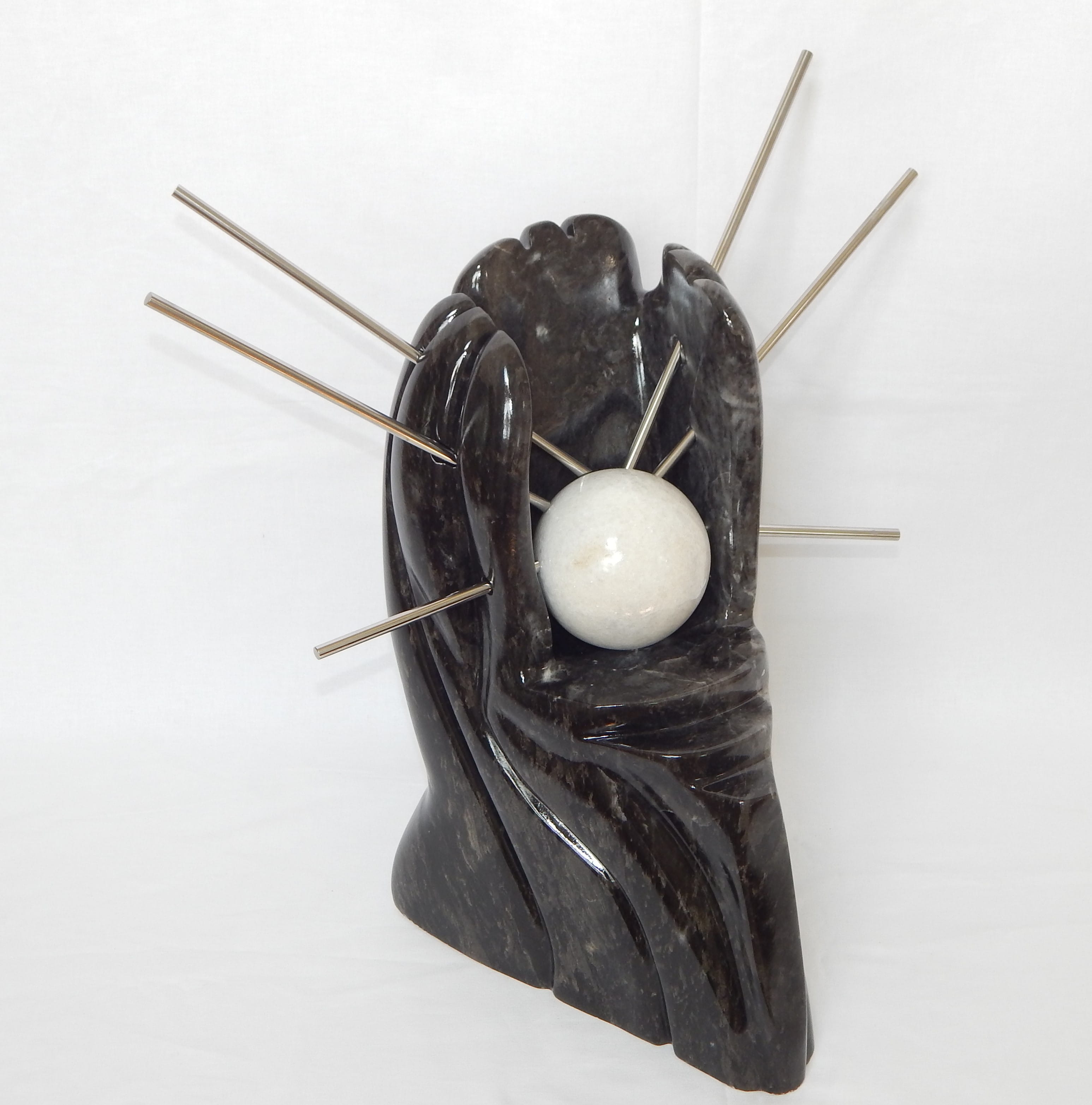 Wizard’s Myst & white marbles, stainless steel rods, 41 cm tall x 41 cm wide x 25 cm deep, (16” tall x 16” wide x 10”)