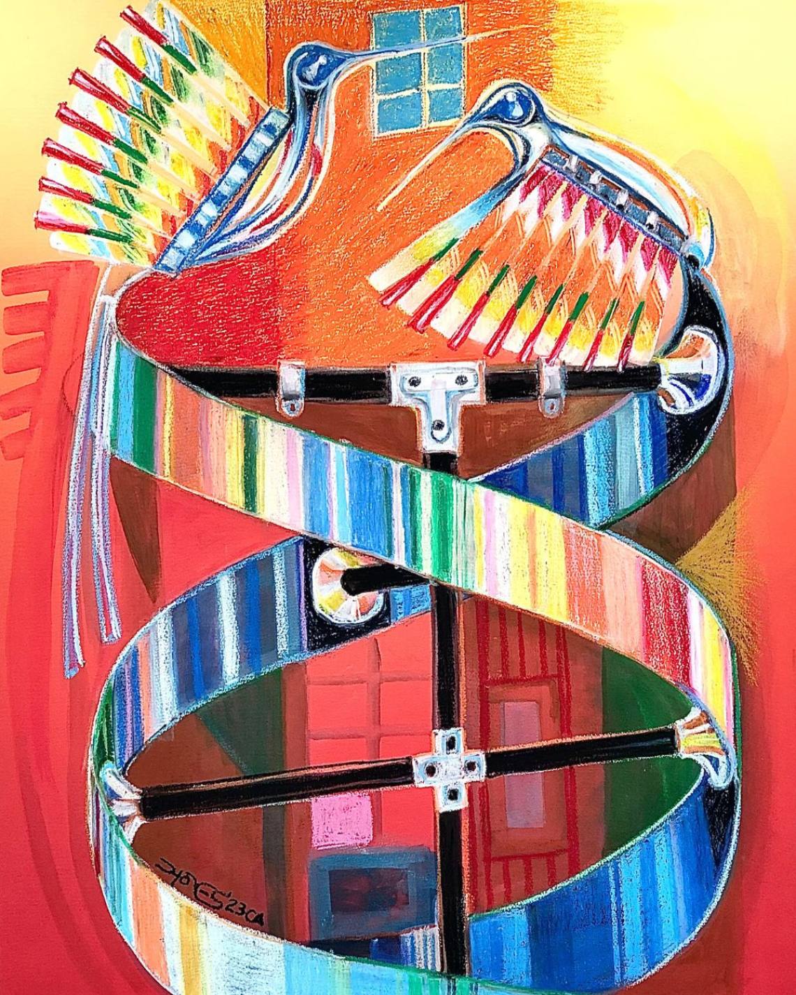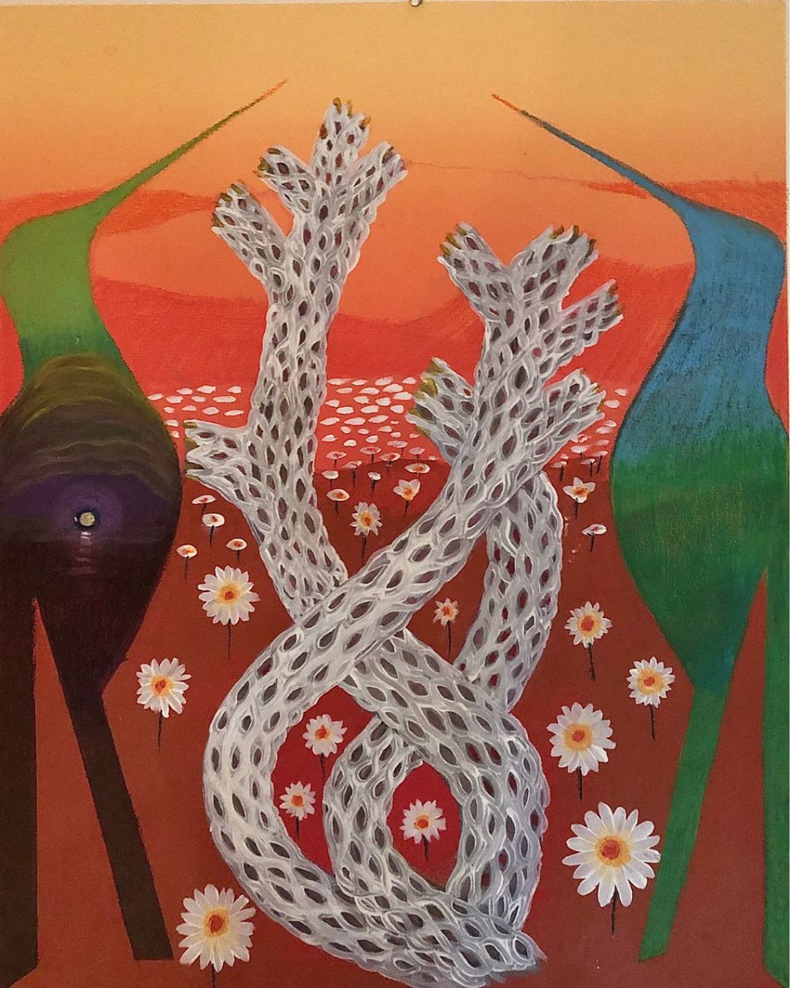 Die Motive in "Mating Dance on Syncona" sind sehr ähnlich den Mustern auf peruanischem Gewebe. War die Absicht, Kolibris zu zeigen, die im Morgen- oder Abendlicht in Peru tanzen? Oder erkundete der Künstler einfach Formen und Farben, die das Morgen- oder Abendlicht auf den Federn der Vögel am besten widerspiegeln, während der Kaktus im Hintergrund die Idee unterstützt, dass die Szene in einer trockenen südamerikanischen Landschaft stattfindet? "Mating Dance" von Kolibris in versteinertem Cholla ist ebenso faszinierend in seinen Formen und Farben (wie "Mating Dance Roots and Rags"), was den Betrachter dazu bringt, das Geheimnis in ihnen zu hinterfragen.
