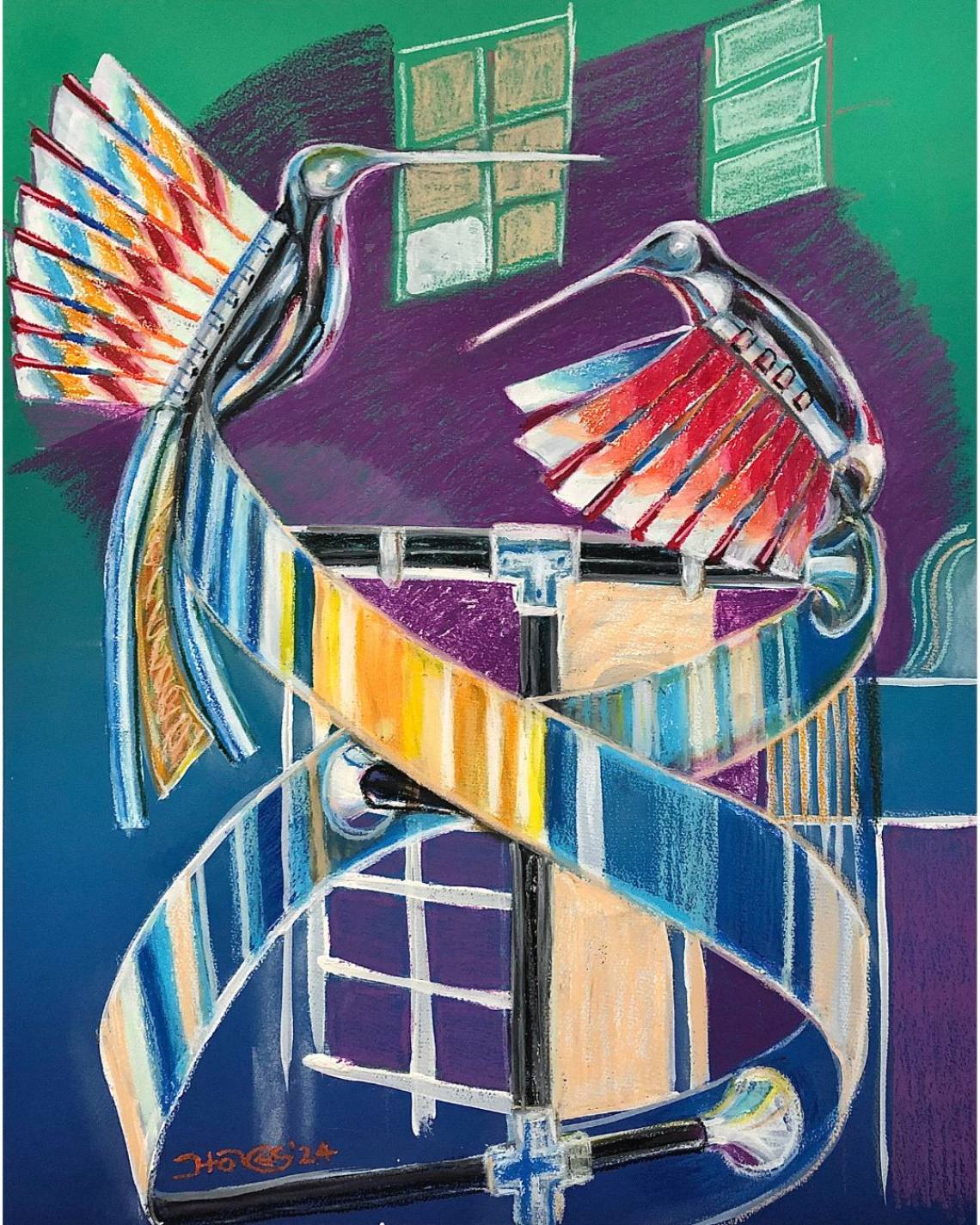 In anderen Gemälden wird der Kontrast durch die scharfen, schwarz ausgeschnittenen Silhouetten von Vögeln auf einem Farbverlauf von Rot und Orange geschaffen, der an das sanfte Licht eines Sonnenaufgangs oder Sonnenuntergangs auf einer Insel erinnert. Manchmal sind die Körper der Kolibris klar gegen einen verschwommenen Hintergrund umrissen und haben sehr stark geometrisch ausgeschnittene Federn, die ein Gefühl von Vibration vermitteln. Wenn man einen fliegenden Kolibri in der Realität beobachtet, wird einem klar, dass man, während er scheinbar anhält, um Blütennektar zu fressen, nur seinen Körper klar sehen kann, während seine hektisch flatternden Flügel zu einem verschwommenen Bild werden, wie es in diesen Gemälden dargestellt ist. Doch hin und wieder machen sie Bewegungen, bei denen man einzelne Federn und eine Vielzahl von Farben unterscheiden kann (die ebenfalls klar in einigen der Kunstwerke dargestellt sind). Die unrealistische Darstellung wird sehr realistisch, wenn man zweimal darüber nachdenkt!A review of Bernard Stanley Hoyes solo exhibition - The Mating Dance of Hummingbirds