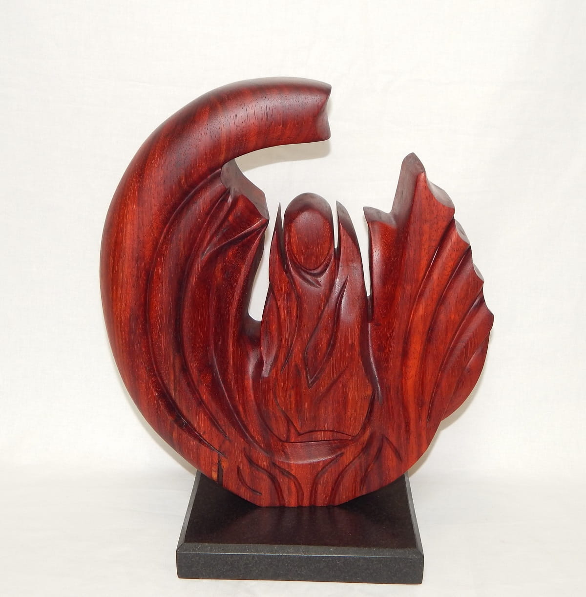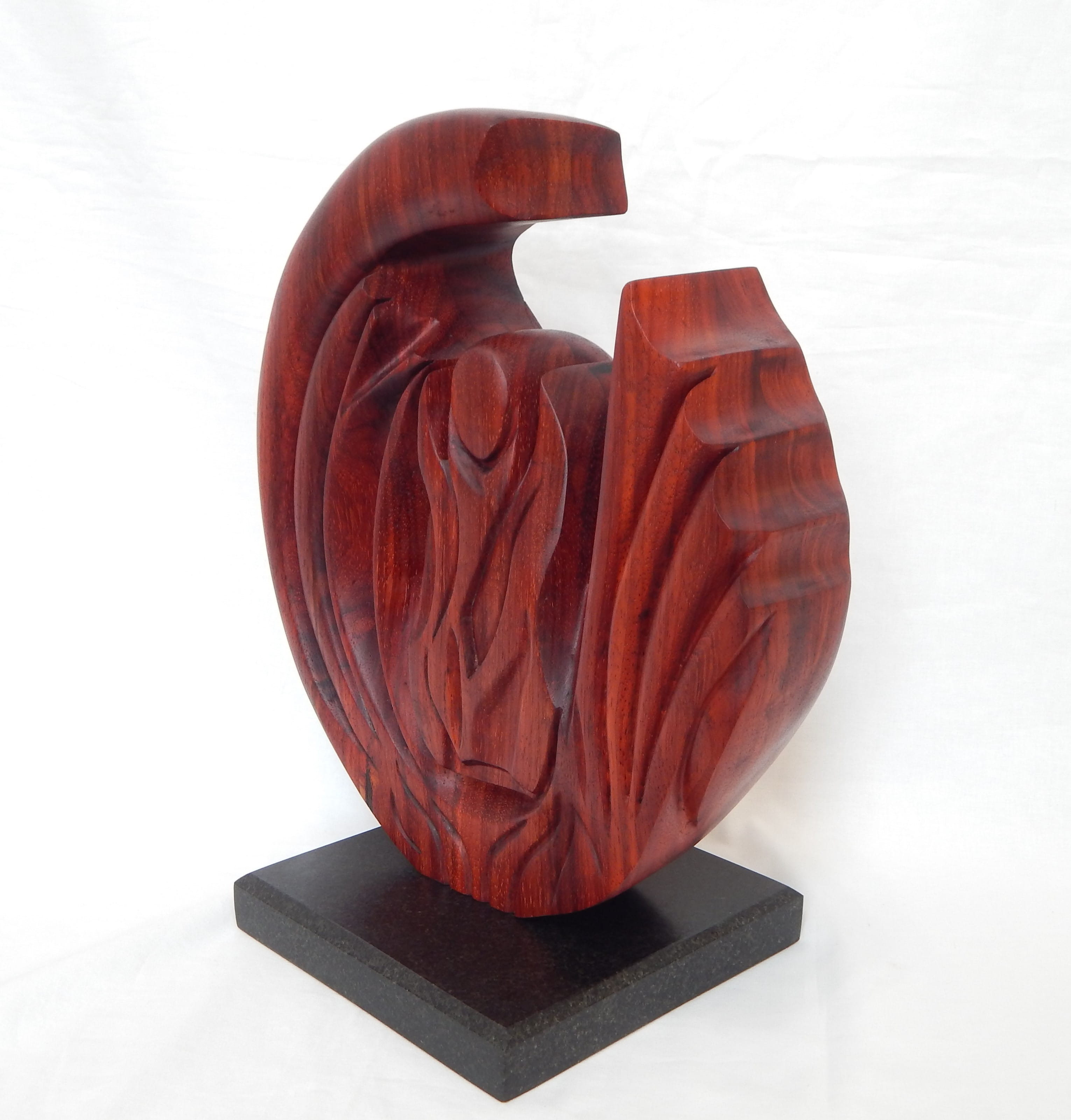 Padauk wood sculpture on a granite base, 39 cm x 33 cm x 10 cm, (base is 20 cm x 20 cm)  15.5” tall x 13” wide x 4” deep (Base: 8” x 8")