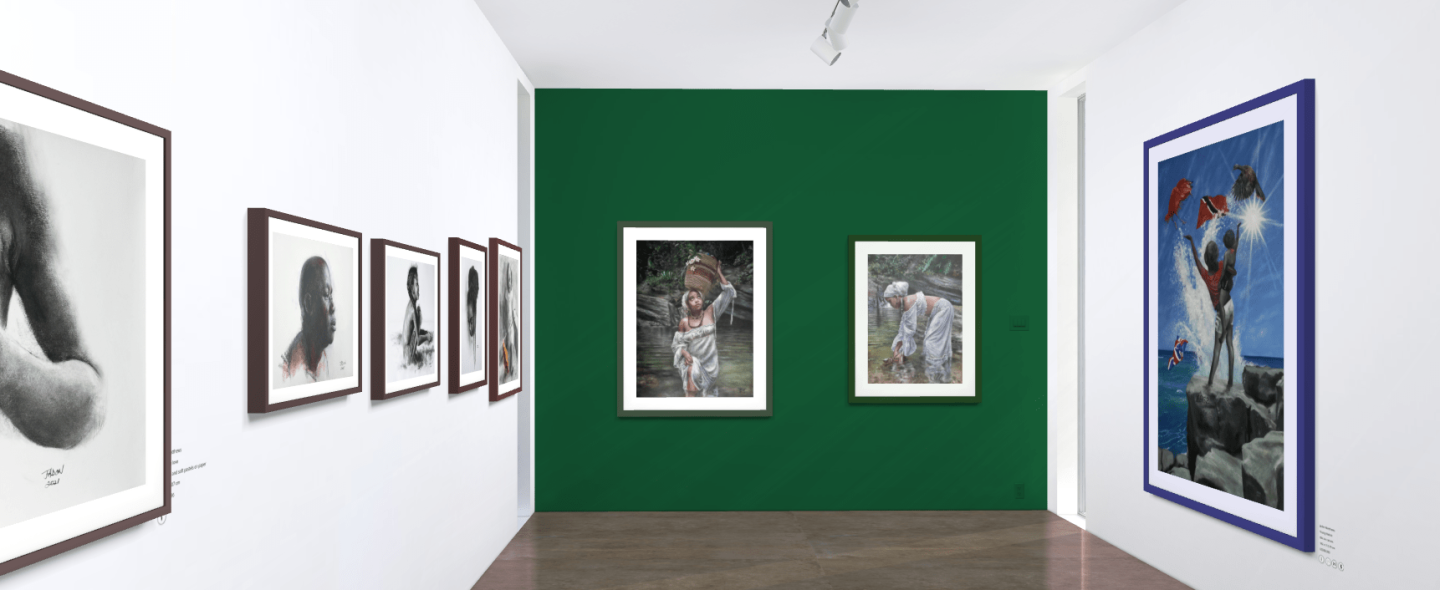 Most artworks in this exhibition are black and white and offer an exquisite play of light and shade that brings the subject to life. In some pieces, colourful details catch the viewers’ eyes and invite them to explore more of the artwork by questioning the contrast. Colour can also be found melted into the black and white depiction, like in The Passenger, as if stating that nothing is ever black and white, nothing is ever as simple as it seems. Few artworks such as River Washer and River Rince will satisfy viewers preferring colourful and vibrant yet soft rendering of daily life that, once more, links past and present times in Trinidad and Tobago in Jadon Matthew’s beautiful work.