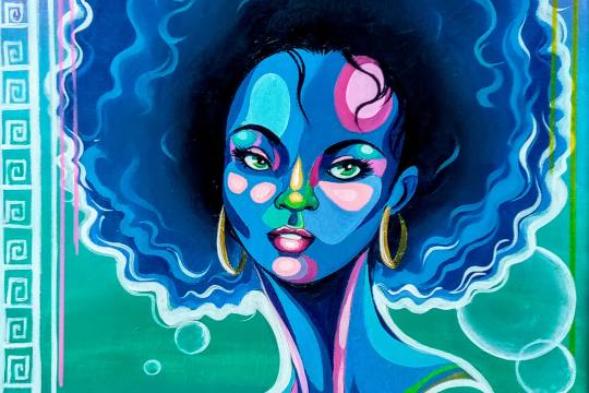 Acrylic on cotton, 122x122 cm. The artwork features roses floating on air pulsing with life.